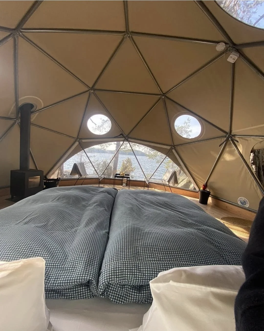 Just a short boat ride from Stockholm, Island Lodge feels like an escape into another rhythm entirely. The island itself is car-free, crowd-free, and tuned to the sound of the sea. There are only seven luxury canvas tents, each spaced out for privacy and perched just meters from the shoreline. Inside: soft beds, linen sheets, lantern light, and the kind of silence you can’t find in cities.