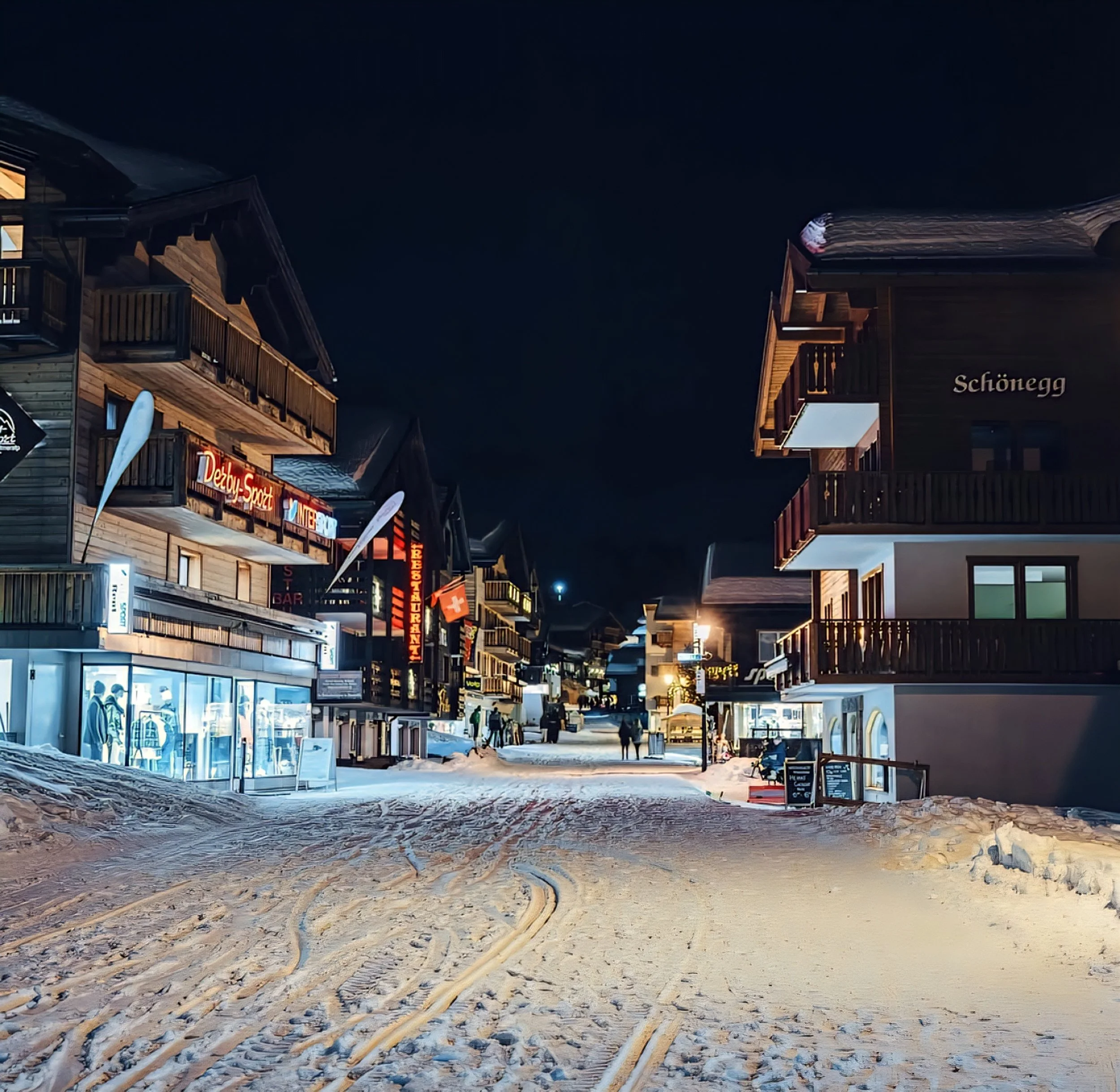 At night, it gets even quieter. The streets are lit, but dim enough that you still notice the stars. You might walk to dinner with a headlamp or just follow the glow from the windows of nearby chalets. It feels like winter the way you imagined it as a kid: quiet, calm, and a little bit magical.