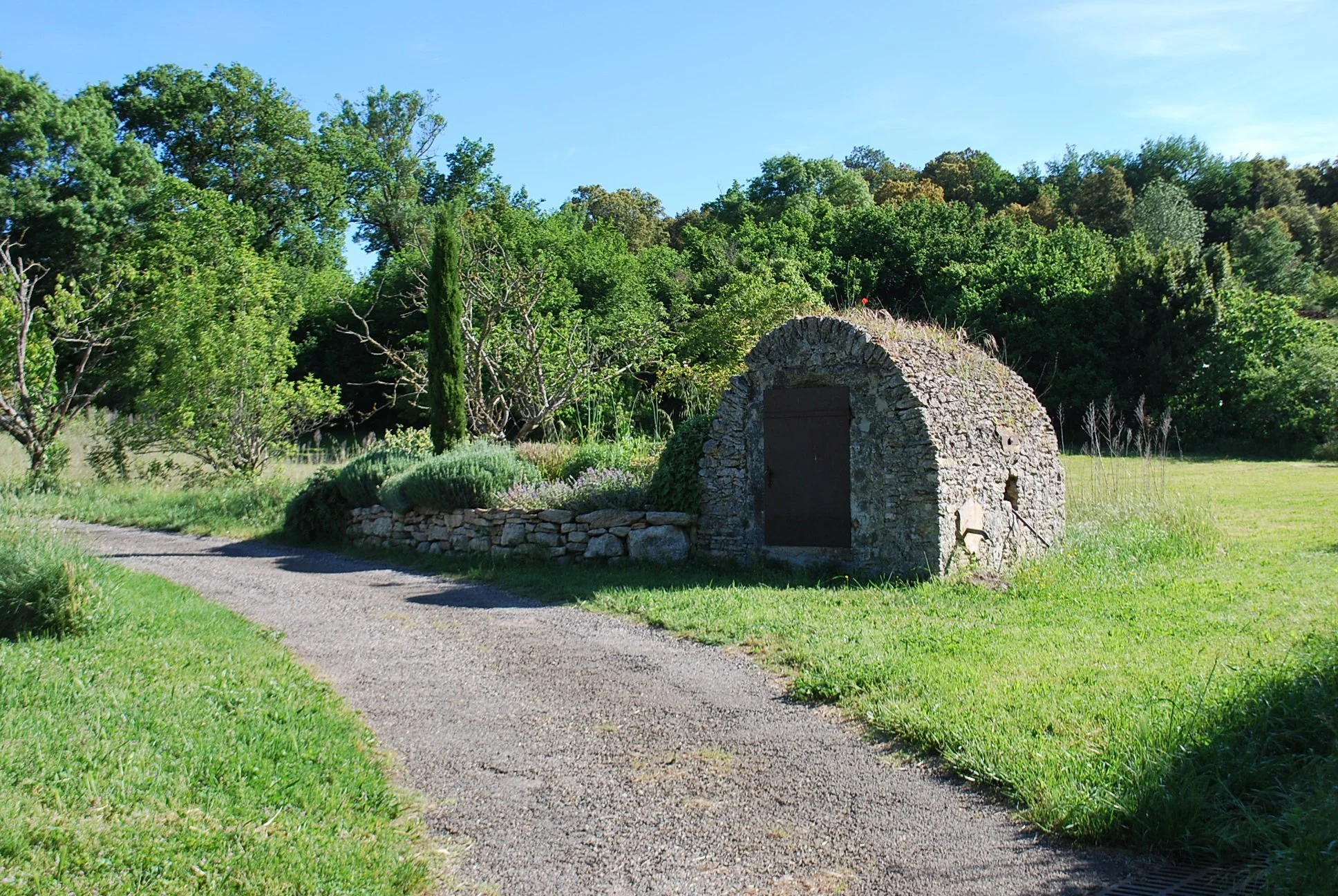 After lunch, stretch your legs with a walk to the Vallée de l’Eure. The route starts right from town along the Chemin des Capitelles, following part of the old Roman aqueduct trail. It’s an easy 20-minute walk downhill, lined with low dry-stone walls, wild thyme, and the occasional tiny stone hut (capitelle) once used by shepherds.